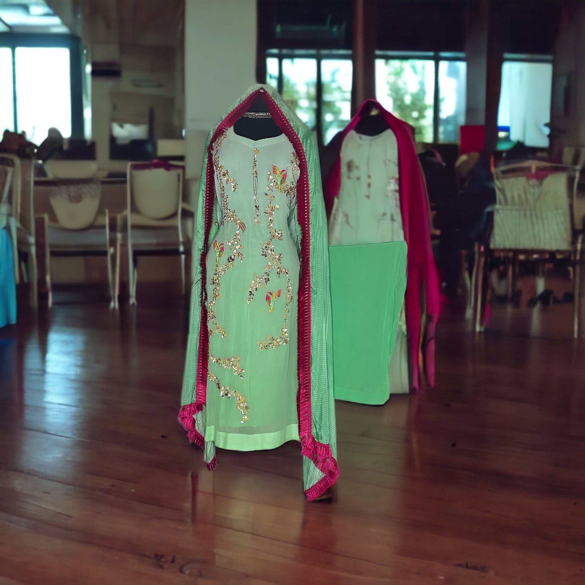 This alluring two-tone formal/partywear suit consists of pure georgette green fabric and is elegantly adorned with beautiful handwork. It is accompanied by a luxurious pure tabbi silk dupatta, finished with a magenta frill lacing. Perfectly tailored for a graceful look.